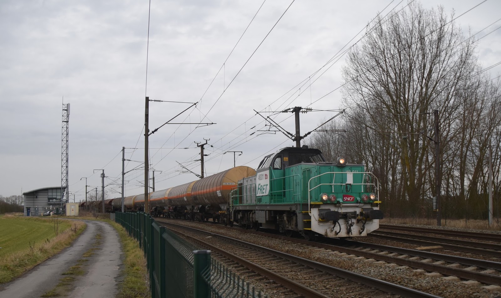 et de wagons à ballastières, est vue direction Somain, qui a croisé...